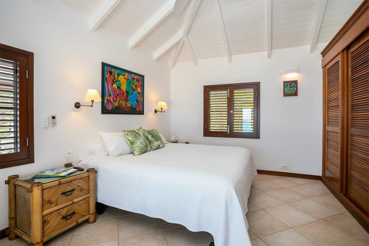 Blue Beach sits on a hillock above the shore. It's an exotic, luxurious cottage that exudes Old World Caribbean style overlaid with a contemporary attitude. The views are simply breathtaking. You see the full length of Baie Lounge beach; straight ahead is the sapphire blue sea and the magical island of Saba. Sunsets are amazing. Embedded in lush tropical gardens, the house is composed of two wings flanking a large pool centered in a tumbled travertine terrace that expands the full length of the residence.