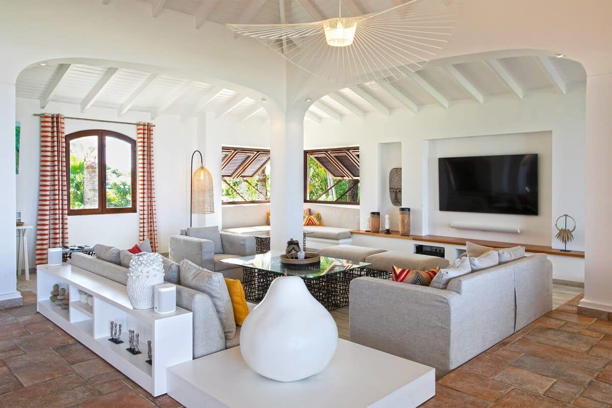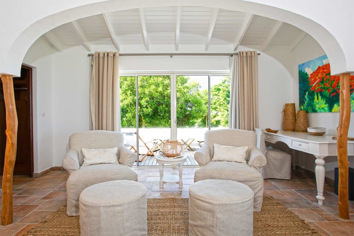 The interiors are spacious with plenty of stations throughout the villa to relax and unwind in. Within the centre of the home, is two distinct living areas in which one features off-white furnishings with earthy accents, while the other is an outdoor retreat shaded by the grand terrace. The rustic country kitchen, complete with black stone granite countertops, encourages conversation with loved ones and friends. This space is ideal for cooking with the large fridge and the expansive, traditional stove; perhaps guests could hire a personal chef to indulge in a Caribbean culinary experience. The dining room promotes delicious meals to be enjoyed, with up to 12 seats for accommodating all the clients along with any additional visitors that may venture to the property.